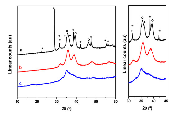 Figure 5. XRD profiles of calcined catalysts derived from hydroxycarbonate precursors: (a) CuO/ZnO-Al-W/O (), (b) CuO/ZnO-Al-W1 (), (c) CuO/ZnO-Al-W3 () (o CuO, + ZnO, * NaNO3).
