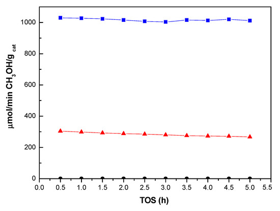 Figure 8. Activity measurements in methanol synthesis from syngas vs. time on stream (TOS) (250 °C, P = 3 MPa, GHSV (gas hourly space velocity) = 32,700 h−1) over: (●) Cu/ZnO-Al-W/O, () Cu/ZnO-Al-W1, () Cu/ZnO-Al-W3.