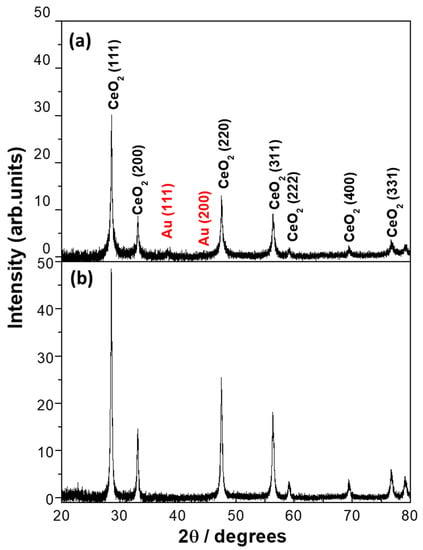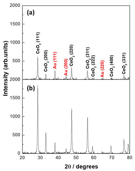 The synthesis methods of Au/CeO2 nanoparticle catalysts with high catalytic activity toward low-temperature CO oxidation could provide a great solution to many environmental issues such as air pollution. Several physical and chemical techniques have been employed in the synthesis of highly active Au/CeO2 nanoparticle catalysts; most of these processes have employed liquid mixtures or solutions [30,31,32] or other methods [33]. Recent reports suggest that Au nanoparticles’ catalytic performance is greatly influenced by the size, shape, and chemical and physical properties of supporting materials [34].
