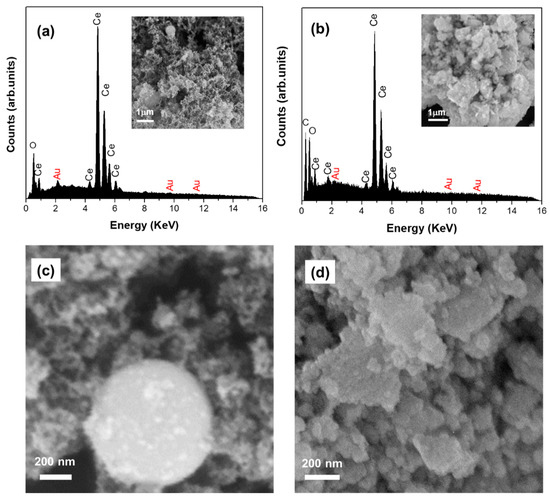 We performed an SEM on both samples to investigate the catalysts’ morphology. Figure 2 shows the SEM micrographs of the LVCC and DP morphologies. Two types of morphologies can be distinguished for the LVCC and DP samples. The LVCC has two types of CeO2 particles: elongated particles with web-like structures where both Au and CeO2 are in the nanoscale, and metallic Au nanoparticles that are dispersed on large CeO2 spherical particles, as shown in Figure 2a,c. The morphology of DP consists of large aggregates, though the metallic Au nanoparticles cannot be observed on the CeO2 particles, as shown in Figure 2b,d. Energy Dispersed X-ray (EDX) spectra of fresh wt% Au/CeO2 nanoparticle catalysts show that both samples consist of Au, Ce, and O2 with small carbon from the sample holder. However, the LVCC showed a slightly higher amount of Au at the surface of CeO2 particles (Figure 2a) than the DP sample (Figure 2d).