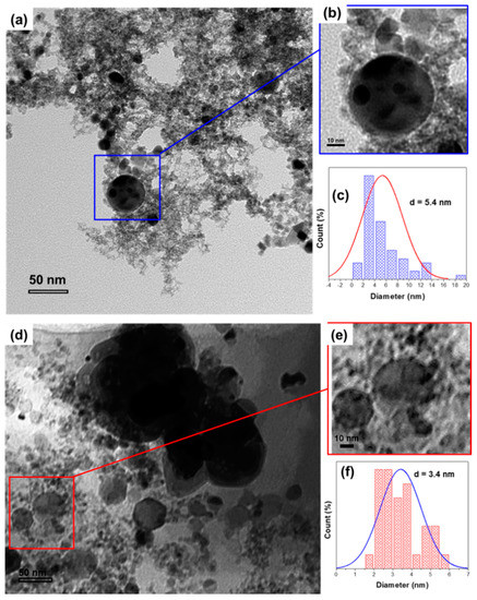 TEM micrographs and particle size distribution of Au/CeO2 prepared by the physical method (LVCC) (a–c) and the chemical method (DP) (d–f)., after the heat treatment in the CO/O2 mixture (second light-off), the light-off temperature was shifted for both catalysts—from 50 °C to 27 °C for the LVCC catalyst and from 0.1 °C to 28 °C for the DP catalyst—as shown in Figure 8. Table 3 shows the activities of Au/CeO2 prepared by physical and chemical methods after heat treatment in the CO/O2 mixture (second light-off).