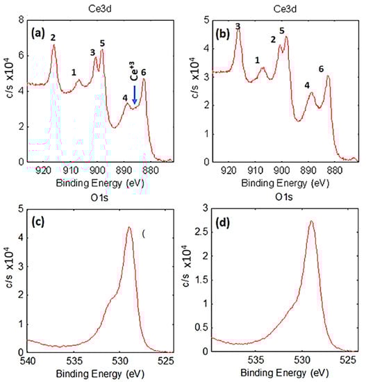 The XPS analysis of the Ce 3d and O 1s core-level peaks of LVCC and DP methods is presented in Figure 4. Chemically, the high-resolution Ce 3d spectrum was consistent with Ce4+ (including similar shake-up peaks). The spectrum shows two primary peaks, “1” and “4”, corresponding to Ce 3d3/2 and Ce 3d5/2 photoelectron peaks. Peaks “2” and “6” are the respective Ce 3d3/2 and Ce 3d5/2 shakedown peaks, while peaks “3” and “5” are the respective Ce 3d3/2 and Ce 3d5/2 shake-up peaks [47]. In the LVCC sample, a tiny peek at ~885.7 eV, as shown in Figure 3a, might indicate the presence of a trace Ce3+, which is reported to have a binding energy of ~885.8 eV, and this peak was not present in the DP sample [48,49,50]. Furthermore, the peak centered at ~529.7 eV corresponds to O2− or lattice oxygen in CeO2. Besides, another core-level O 1s peak was observed at the binding energy of 530.24 eV in the LVCC sample, indicating the presence of an oxygen vacancy in the lattice site of CeO2 nanoparticles [51]. The binding energies of Ce 3d and O 1s are consistent with those of stoichiometric CeO2.