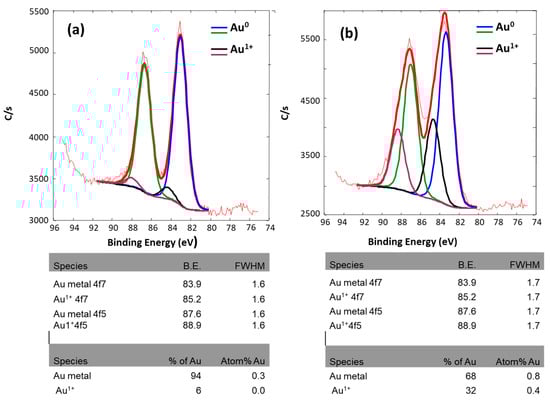 The curve fitting of both samples’ Au 4f spectrum indicated that both contained mostly Au0 and small amounts of Au1+ species. The XPS results revealed that the DP sample had a higher Au level and included more Au1+ than LVCC.