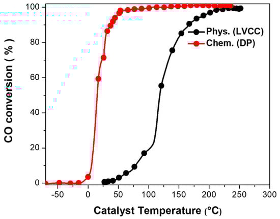 The Au/CeO2 catalysts’ activity as synthesized by physical and chemical methods was measured as a function of the catalyst temperature (first light-off). Table 2 summarizes the activities of both samples.