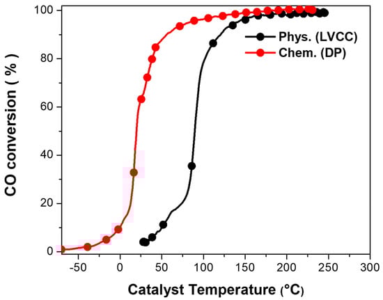 Comparison between activities of fresh Au/CeO2 (first light-off) by a physical method (LVCC) and chemical method (DP). Sample mass = 10 mg, flow rate = 100 cc/min.