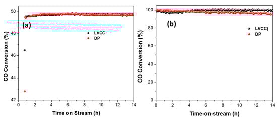 Long-term stability of Au/CeO2 prepared by LVCC and DP methods at (a) 50% conversion and (b) 100% conversion. Sample mass = 10 mg, flow rate = 100 cc/min.