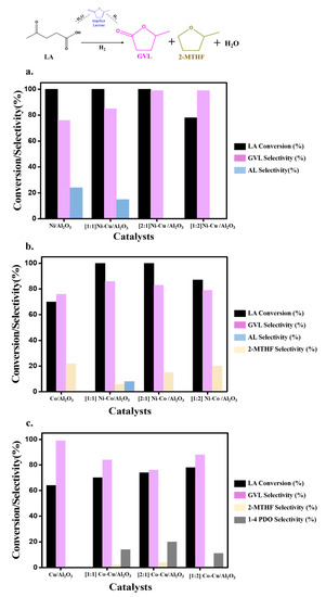 Gebresillase, M.N.; Raguindin, R.Q.; Kim, H.; Seo, J.G. Supported Bimetallic Catalysts for the Solvent-Free Hydrogenation of Levulinic Acid to γ-Valerolactone: Effect of Metal Combination (Ni-Cu, Ni-Co, Cu-Co). Catalysts 2020, 10, 1354. https://doi.org/10.3390/catal10111354