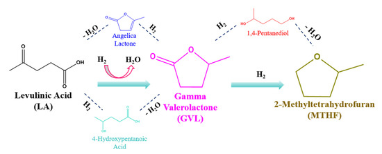 - Dutta, S.; Yu, I.K.M.; Tsang, D.C.W.; Ng, Y.H.; Ok, Y.S.; Sherwood, J.; Clark, J.H. Green synthesis of gamma-valerolactone (GVL) through hydrogenation of biomass-derived levulinic acid using non-noble metal catalysts: A critical review. Chem. Eng. J. 2019, 372, 992–1006. [Google Scholar] [CrossRef]
