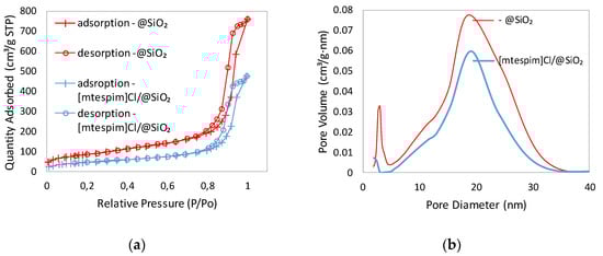 (a) Nitrogen adsorption–desorption isotherms; and (b) Size distribution plots of synthesized silica @SiO2 and the catalyst immobilized on the @SiO2 ([mtespim]Cl/@SiO2) (see also in ESI, Figures S1–S4).