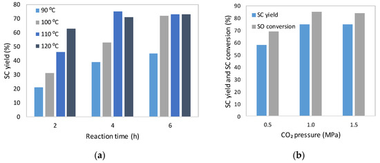 The effect of temperature in the range of 90 to 120 °C and reaction time (from 2 to 6 h) on the synthesis of styrene carbonate was investigated (Figure 3a). It can be seen that as the temperature increased up to 100 °C, the SC yield also increased. Above this value, the product yield remained practically unchanged for the reactions carried out for 4 and 6 h. However, the conversion of styrene oxide increased and reached almost 100% for the reactions conducted at a temperature above 110 °C for 6 h. GC-MS revealed that apart from benzaldehyde, phenyl glycol was observed at elevated temperatures. In addition, dimers and oligomers of styrene oxide and styrene carbonate also formed during the process. Therefore, further experiments were carried out at 110 °C for 4 h. The SC yield increased from 58% to 75% with increasing pressure from 0.5 MPa to 1.0 MPa (Figure 3b). A further pressure increase did not affect SO conversion and SC yield.