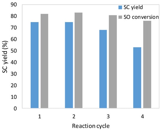 Studies on the effect of the amount of catalyst showed that a two-fold increase in the amount of [mtespim]Cl/@SiO2 from 0.25 to 0.5 mol% using the same amount of cocatalyst caused a three-fold increase in SC yield (Table 3, entries 5 and 7). However, a further increase in the amount of immobilized catalyst (from 0.5 to 1.0 mol%) did not affect the yield of styrene carbonate, while the conversion of styrene oxide increased. Most likely, styrene oxide undergoes side reactions leading to the formation of SO or SC dimers and oligomers [30]. In turn, the use of a five-fold increase in the amount of cocatalyst (0.10 mol% instead of 0.02 mol%) resulted in only a two-fold higher yield of SC. This outcome confirms the synergistic effect of the catalytic system, consisting of ionic liquid and Lewis acid, in promoting the studied reaction.