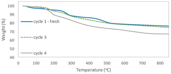The activity of the immobilized catalyst in consecutive reaction cycles was examined. After reaction, the catalyst was recovered by simple filtration, washed with ethyl acetate, and dried in the air. Recycling studies showed that the supported catalyst can be used in up to three cycles without significant loss in its catalytic activity and selectivity (Figure 4). A decrease in styrene carbonate efficiency was observed in the fourth cycle. Styrene carbonate yield dropped to 53%. Based on the results of elemental analysis, it can be stated that after the fourth cycle the amount of nitrogen decreased, which suggests partial release of the catalyst (Table 2). Thermogravimetric analysis of the supported catalysts revealed that weight loss in the range 130 to 1000 °C was slightly higher for the catalyst after the third reaction cycle (24.20%) than for a fresh one (20.47%). However, much higher weight loss (30.79%) was observed for the catalyst after the fourth cycle (Figure 5 and Figures S5–S7 in Supplementary Materials). This might indicate that contaminants were retained on the catalyst surface. Most likely they were by-products, such as dimers or oligomers that might not have been wash out after the reaction cycle. A slight change in the surface roughness of the catalysts after consecutive runs can be observed (Figure 6).