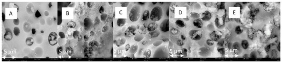 SEM images of [mtespim]Cl/@SiO2: (A) fresh; (B) after the first cycle; (C) after the second cycle; (D) after the third cycle; (E) after the fourth cycle.