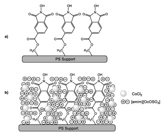 The obtained PS-NHPI was coated with a layer of [emim][OcOSO3] ionic liquid containing dissolved cobalt(II) chloride to form PS-NHPI@CoCl2@[emim][OcOSO3]. The ionic liquid was selected from a wide range of potential imidazolium ionic liquids based the research presented in [41] regarding SCILL systems containing NHPI immobilized on silica gel (Figure 1c). It was then shown that using [emim][OcOSO3] gives the best results in terms of recycling the SCILL system.
