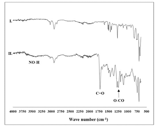 FT-IR spectra of PS-Cl-2 (I) and PS-NHPI-2 (II).