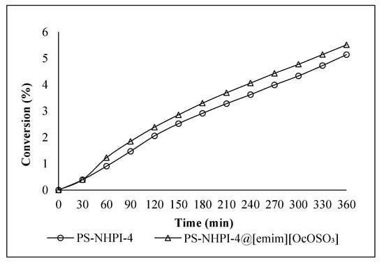 Next, the influence of the [emim][OcOSO3] ionic liquid layer on the activity of studied systems was determined. First, we observed that coating the most active heterogeneous catalyst PS-NHPI-4 with a layer of [emim][OcOSO3] ionic liquid barely affected its activity (Table 3, entries 2,3). The similar conversions of ethylbenzene (approx. 5%) carried out in these two cases suggest that the ionic liquid does not limit the contact between the reactant and the active centers of the NHPI catalyst (i.e., −NOH groups). However, the addition of [emim][OcOSO3] caused a slight decrease in selectivity toward ethylbenzene hydroperoxide (from 29.0% to 19.1%) and an increase in selectivity toward acetophenone (from 12.7% to 20.4%). Based on Figure 4, the oxidation reactions performed by the PS-NHPI-4 and PS-NHPI-4@[emim][OcOSO3] systems followed very similar trajectories. A different relationship was observed in our previous work [41], which discussed ethylbenzene oxidation by a system containing a heterogeneous NHPI catalyst immobilized on silica gel (SiOCONHPI; Figure 1c). Specifically, covering the SiOCONHPI catalyst with the ionic liquid, [bmim][OcOSO3], caused a decrease in the conversion of ethylbenzene, from 8.6 to 6.1%.
