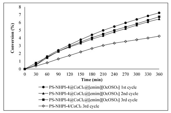 The results presented in Table 4, entries 17–31, illustrate that it is possible to recycle the PS-NHPI@CoCl2@[emim][OcOSO3] systems while suffering only a slight decrease in overall catalytic activity and selectivity toward acetophenone production. For example, the conversions achieved by PS-NHPI-3@CoCl2@[emim][OcOSO3] decreased from 5.9% > 5.7% > 5.4%, in the 1st, 2nd, and 3rd reaction cycles, respectively. The system’s selectivity toward producing acetophenone over those three cycles remained essentially constant, and it was as high as 66.2% in the third reaction cycle. None of the PS-NHPI@CoCl2@[emim][OcOSO3] systems showed the significant increase in selectivity toward ethylbenzene hydroperoxide in subsequent reaction cycles, as was observed for the PS-NHPI/CoCl2 systems without IL. The obtained results suggest significantly limited elution of CoCl2 from the IL layer, which indicates greater potential for recycling and reusing SCILL/SILP systems. Analyzing the course of the ethylbenzene oxidation reaction carried out by the PS-NHPI-4@CoCl2@[emim][OcOSO3] system over three reaction cycles showed no significant differences in the oxidation rate during subsequent cycles (Figure 7).