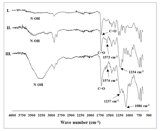 The FT-IR spectra allowed for identification of the deformation vibration bands (δC-Cl) at approximately 1265 cm−1 and the bands corresponding to the stretching vibrations (νC-Cl) at around 823 cm−1, which are characteristic of the chloromethyl group (Table 1). The SEM analysis showed that the resins have a consistent circular grain shape within the size range specified by the manufacturer (Figures S1–S5). According to the procedure described in [24], trimellitic anhydride was first immobilized on a PS-Cl supports through formation of ester bonds, and in the second reaction step, the N-OH group was formed following a reaction with hydroxylamine hydrochloride (Scheme 2). The obtained heterogeneous catalysts PS-NHPI were characterized using FT-IR analysis (Figure 3, Figures S11–S14, Table 2), elemental analysis (Table 2), and SEM (Figures S6–S10).