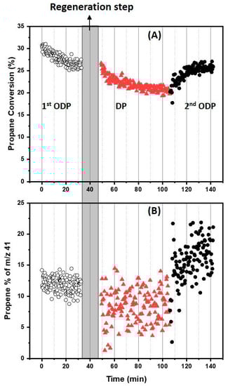 The subsequent oxidative and non-oxidative dehydrogenation of propane activity over MoOx/Al2O3 at 500 °C shown as (A) Propane conversion and (B) Propene formation. Propene formation is presented as the contribution of propene to the mass spectrometry response of m/z 41 expressed as a%. This is calculated by subtracting the contribution of propane to m/z 41. Refer to the Materials and Methods section for activity test details.