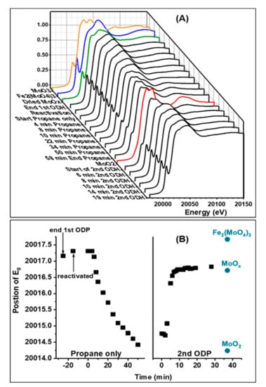 Interestingly, the propene selectivity got markedly better during the second ODP reaction, increasing from a contribution to m/z 41 of 10% during the DP cycle, to almost 20% by the end of the second ODP cycle (Figure 1B). Significantly, the propene formation was substantially improved (5%) in the second ODP run as compared to that in the first ODP at similar propane conversion. Within the first 10 min on stream of the second ODP run, the oxygen content in the feed considerably depleted suggesting the combustion of carbon deposits and perhaps occurrence of a Mo oxide redox cycle. The former is consistent with the rapid formation of CO2 and H2O as noted above. Excluding these first 10 min of the second ODP run which can be attributed to coke combustion, the amount of CO2 formed in both ODP runs was approximately equal, no CO2 is detected under DP. Despite significant differences in propene formation in the first and second ODP runs, similar CO2 formation indicated the occurrence of competitive reactions (other than combustion) such as aromatization, which is known for Mo oxide based catalysts [11,15,18,19,20,21]. Such side reactions might have dominated in the first ODP run while they appeared to have been suppressed in the second ODP. The improved propene formation and suppressed side reactions in the second ODP may have been a result of the DP run that fell between the two ODP runs of the reaction cycle. Therefore, the effect of reaction cycle on the nature of active/selective Mo oxide species and the nature of surface adsorbed species is of interest. To this end, in situ XANES, which is sensitive to the oxidation and coordination state of Mo oxide, under the reaction cycle was studied to capture the redox dynamics of the catalyst.