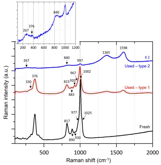 Raman spectra of hydrated fresh (before the reaction) and used (after the reaction cycle) catalysts at room temperature. Magnified region of the used catalyst—type 2 is shown in the inset.
