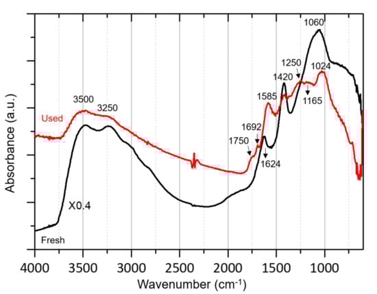 The DRIFTS spectra of the fresh and used catalysts are shown in Figure 4. The fresh catalyst showed broad bands centred around 3500, 3250, 1624, 1420 and 1060 cm−1. The bands at 3500 and 3250 cm−1 were assigned to the stretching modes of hydrogen bonded OH groups on the catalyst surface (including physisorbed water) [36,37,38]. The corresponding H–O–H bending mode appeared at 1624 cm−1. The bands at 1420 and 1060 cm−1 could be due to surface adsorbed carbonate-like species and surface Al–O vibrational mode of the support γ-Al2O3, respectively [39,40]. The broad features between 1060 and 800 cm−1 were tentatively assigned to isolated [MoVIO4]2− like species [20,40,41], in line with the in situ XANES and Raman spectra (Figure 2 and Figure 3).