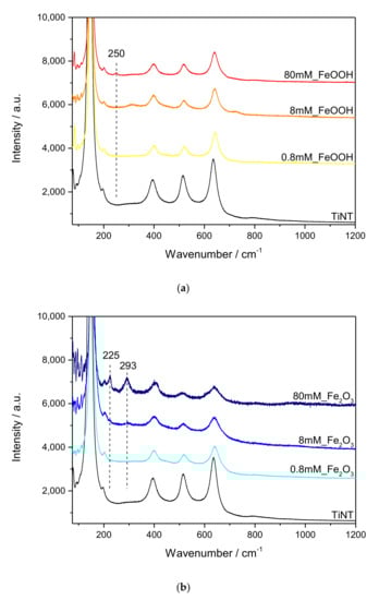 Micro-Raman spectra of (a) FeOOH modified TiNT and (b) Fe2O3 modified TiNT samples with specific Raman active bands of Fe modifiers denoted above spectra.