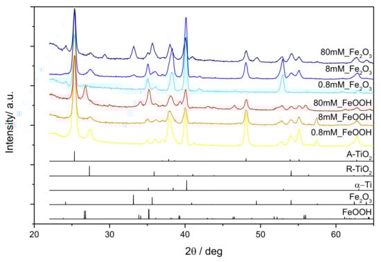GIXRD patterns of all samples are shown in Figure 4 along with reference diffraction profiles for anatase TiO2 (JCPDS card no. 21-1272), rutile TiO2 (JCPDS card no. 21-1276), α-Fe2O3 (JCPDS card no. 33-0664), β-FeOOH (JCPDS card no. 34-1266) and hexagonal α-Ti substrate (JCPDS card no. 44-1294) which were used for the identification of diffraction peaks and determination of phase composition in samples. The patterns of 0.8 mM_FeOOH and 8 mM_FeOOH samples disclose dominantly anatase TiO2 with small fractions of rutile TiO2 phase (~10% for 0.8 mM_FeOOH, ~5% for 8 mM_FeOOH). In the 80 mM_FeOOH sample anatase-TiO2 (~60%) and tetragonal β-FeOOH (~30%) were observed. Furthermore, the 0.8 mM_Fe2O3 and 8 mM_Fe2O3 samples disclose anatase TiO2 as a major phase, but also rutile TiO2 and α-Fe2O3 phases (~5% for each phase). Finally, the phase composition of the 80 mM_Fe2O3 sample is similar to the composition of 0.8 mM_Fe2O3 and 8 mM_Fe2O3 samples, however, the fraction of rutile TiO2 is reduced and the fraction of α-Fe2O3 is increased.