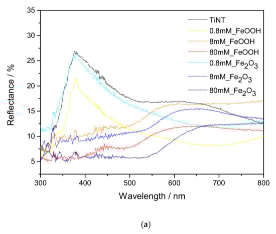 Iron oxides (Fe2O3, FeOOH) are suitable modification candidates that ensure low-cost and practical approach to TiO2 photocatalysis yield improvement. Furthermore, their band gaps are in visible light range (1.7–2.3 eV for FeOOH [,] and 1.9–2.5 eV for Fe2O3 []) and thus, by combining the superior semiconducting properties of TiO2 and broader photon absorption energy span of iron oxides, photocatalytic properties of TiO2 nanotubes can be improved due to synergistic effect between iron species and TiO2 [,,].