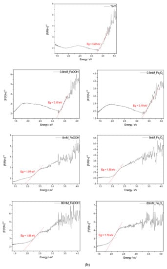 The UV-vis reflectance spectra of the FeOOH and Fe2O3 modified TiNT are shown in Figure 5a. The TiNT display the absorption edge in UV region at ~385 nm. With addition of 0.8 mM, 8 mM and 80 mM FeOOH and Fe2O3, absorption edge shifted towards higher wavelengths. The values of the indirect band gap were obtained by extrapolating the Tauc plot of the Kubelka–Munk function by drawing the line to the x-axis at [F(R)hν]1/2 = 0 (Figure 5b). The band gap for TiNT is estimated to be 3.22 eV. Furthermore, for 0.8 mM_FeOOH, 0.8 mM_Fe2O3, 8 mM_FeOOH, 8 mM_Fe2O3, 80 mM_FeOOH, 80 mM_Fe2O3 samples, band gaps are 3.15 eV, 3.19 eV, 1.91, 1.85, 1.85, 1.79 eV respectively. The narrowing of band gap is due to the coupling of TiO2 with FeOOH and Fe2O3 species on the surface [,]. Higher absorption in the visible light region allows the photocatalyst to harness visible light for photocatalytic reactions.