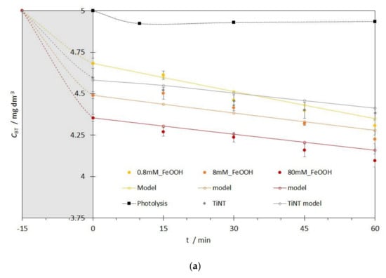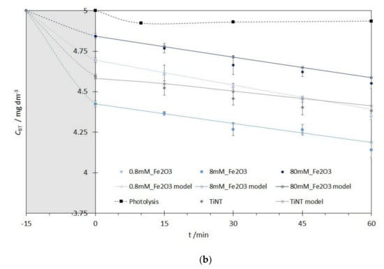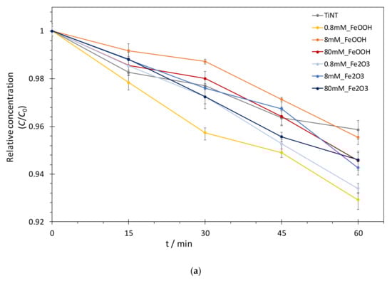 Depending on the photocatalyst, differences in the adsorption of the BT in the dark were observed. For the FeOOH@TiNT sample with the highest Fe concentration (80 mM_FeOOH), most prominent adsorption was observed (Figure 8a, gray region). With the decrease of Fe concentration (8 mM_FeOOH and 0.8 mM_FeOOH), adsorption decreased as well. That can be explained with the higher number of possible sites where hydrogen bonds (O-H) can be established between photocatalyst and the model pollutant.