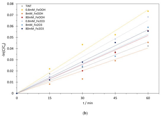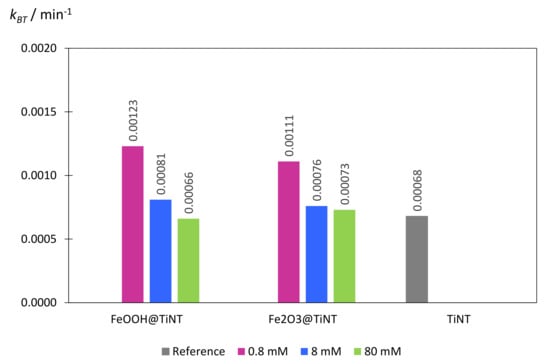 The rate constant (k) was used to compare photocatalytic activity between the reference sample (as-prepared TiO2 anatase nanotubes (TiNT)) and FeOOH or Fe2O3 modified TiNT. Synthesis and FeOOH or Fe2O3@TiNT modification details are explained in the section Materials and methods (see Section 3.1). Modelling of the experimental data (BT concentration as a function of UV/Vis illumination time) was performed according to the pseudo-first order kinetics model (Equation (1)) [,]:
