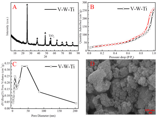 Figure 1A shows the XRD result of the powdery catalyst. It is shown that mainly TiO2 was able to be detected by the device (denoted as triangle marks); the weak peak at about 20° could be assigned to the VOx species, probably owing to its high loading on TiO2. Figure 1B displays the type IV N2 adsorption–desorption isotherms, which possessed an H3-type hysteresis loop, revealing the mesoporous characteristics of catalyst. The corresponding pore size distribution of the catalyst was mainly between 1 nm and 100 nm, as shown in Figure 1C. The specific surface and average pore diameter of the powdery catalyst were 159 m2/g and 9.2 nm, respectively. Figure 1D presents the SEM image, displaying the fine catalyst particles and fine arrangement. The good dispersal of active components, as well as the high specific surface of the catalyst, may have facilitated the improvement of its DeNOx efficiency.