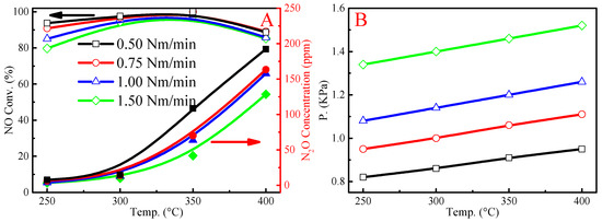 Face velocity is another important factor affecting the catalytic performance of the filter. Figure 5 profiles the effect of face velocity on DeNOx performance and pressure drop over the catalytic filter. As can be seen, the face velocity varied between 0.50 Nm/min and 1.50 Nm/min. In Figure 5A, face velocity of 0.5 Nm/min had the highest NO conversion efficiency and the highest N2O concentration followed by 0.75 Nm/min, next 1.00 Nm/min and lastly 1.50 Nm/min face velocity with both the lowest NO conversion and N2O concentration. The face velocity had the capability of altering the residence time of the flue gas through the filter. High face velocity means short residence, resulting in low NO conversion. Figure 5B gives the relationship between pressure drop and face velocity. The face velocity of 1.50 Nm/min had the highest pressure drop, which was because of the highest face velocity. Meanwhile, the pressure drop also increased with temperature, which was consistent with Darcy’s law. Therefore, a suitable face velocity should be chosen according to the activity, pressure drop and economy in the practical industrial applications.