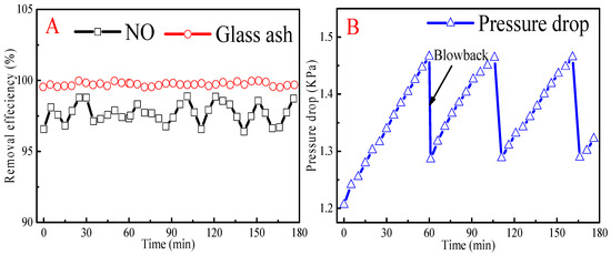The (A) removal efficiency of NO and glass ash together with (B) the corresponding pressure drop during the process of removing NO and ash simultaneously.