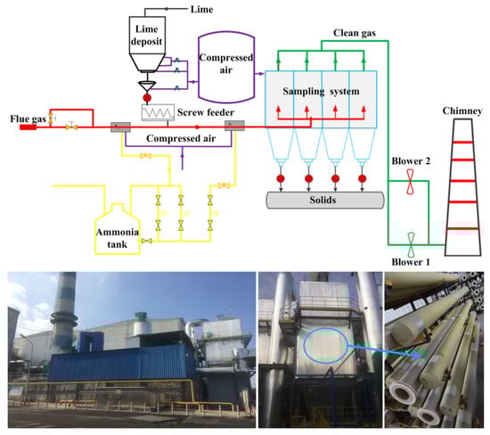 To validate the industrial applicability of the lab-scale results, 2380 large-size V-based catalytic filter (L3000 mm × Φ150 mm) with optimized parameters (catalytic emulsion of AX50 = 202 nm, ~7.5 wt % catalyst loading) were applied in the glass kiln. The basic process and apparatus diagram of the industrial test are provided in Figure 8, which mainly included the ammonia injection, dry desulfurization, compressed air system and sampling system. As shown in the diagram, lime and NH3 were introduced as desulfurizers and SCR reducing agent, respectively. The process of DeNOx and dedusting was carried out simultaneously by a catalytic filter in the sampling system. At the same time, the compressed air was used to blow back the catalytic filter. The SO2 presented in the flue gas could react with lime to form solid particles. The solid particles and glass ash were later separated by the filter and then deposited in the preserved area below the sampling system. Meanwhile, NOx in the flue gas reacted with NH3 through the catalytic filter in the sampling system, and the gas was subsequently cleaned and out to the atmosphere through the chimney.