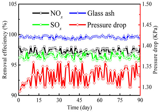 The removal efficiency of NOx, SOx and glass ash together with the pressure drop during the 90-day industrial test (daily average).