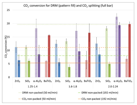 CO2 conversion for different sphere sizes and materials, compared to the results for the non-packed reactor, at the same flow rate (50 mL/min) and at the same residence time (5.52 s; flow rate of 192 mL/min), all at 23 kHz frequency, in a 4.5 mm gap and a set 100 Watt power for both DRM (dry reforming of methane) and pure CO2 splitting. The bars with pattern fill show the results for DRM, whereas the full bars show the correct results for CO2 splitting, obtained from our previous work [2].