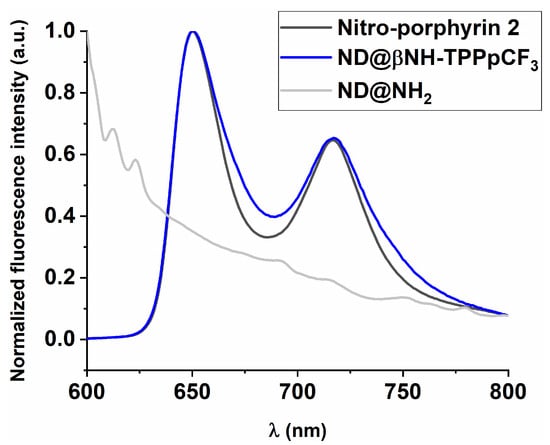 In Figure 1, the normalized fluorescence emission spectra of ND@βNH-TPPpCF3 (blue line), nitro-porphyrin 2 (black line) and ND@NH2 (grey line) are displayed, with excitation at 420 nm using N,N-dimethylformamide (DMF) as solvent. The fluorescence spectrum of nitro-porphyrin 2-immobilized nanodiamonds (ND@βNH-TPPpCF3) is similar to that of the non-immobilized nitro-porphyrin 2 over the whole emission wavelength range (575 to 775 nm). In particular, two strong emission bands at 650 and 720 nm are present. Thus, qualitative analysis of the fluorescence emission spectrum of ND@βNH-TPPpCF3 evidences that the energy of the excited state of porphyrin 2 is not changed by the presence of the material, probably due to the presence of a non-conjugated linker.