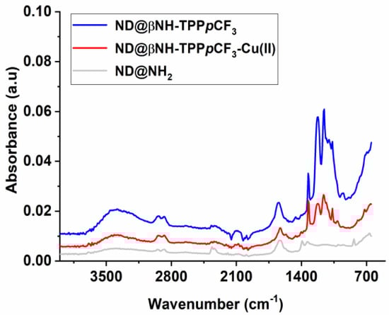 Figure 3 shows the infrared spectroscopic analysis of ND@βNH-TPPpCF3-Cu(II) (red line) and ND@βNH-TPPpCF3 (blue line), compared with the amine-functionalized nanodiamonds (ND@NH2) (grey line). In the 2950–2850 and 1660–1630 cm−1 intervals, all IR spectra show signals characteristic for C–H stretching and amide C=O stretching vibrations, respectively. Moreover, between 1300 and 1700 cm−1, both spectra of ND@βNH-TPPpCF3-Cu(II) and ND@βNH-TPPpCF3 present peaks at 1460 cm−1 (C–H bending) and 1350–1330 cm−1 (C–F stretching), validating the anchoring of the nitro-porphyrins (1 and 2) to the ND materials.