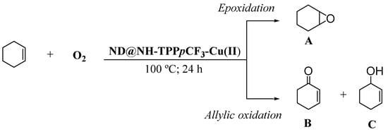 ND@βNH-TPPpCF3-Cu(II) (4 mg; 19.8 × 10−8 mol of Cu) as catalyst and cyclohexene (10 mL; 0.099 mol) as substrate were added to a reactor and then charged with oxygen (O2, 4 atm). The reaction mixture was maintained at 100 °C, during 24 h, under stirring. After this time, the reactor was depressurized and an aliquot from the crude reaction was analyzed by GC.