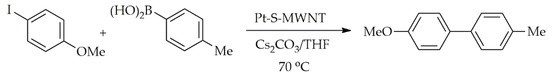 Suzuki coupling reaction between 4-iodoanisole and 4-methylbenzene boronic acid catalyzed by Pt-S-MWNT [72].