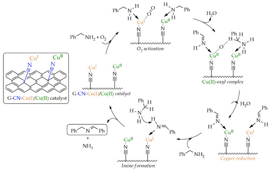 In another approach, Bakandritsos et al. (2019) recently reported a mixed-valence ionic copper catalyst, prepared from cyanographene, G-CN, in which 3.4 wt% Cu ions are homogeneously distributed at the sheet surface as mixed Cu(II) and Cu(I) [76]. The presence of Cu(I) is probably due to specific Cu interactions developed with G-CN support. This catalyst was used with very low metal loading in the synthesis of imines, by oxidative dehydrogenation of amines to imines, but also ketones from benzylic hydrocarbons, obtaining excellent conversions and selectivities, both as a class of intermediated compounds useful for the production of pharmaceuticals (Scheme 5 and Scheme 6). The authors suggested that the imine obtention in the presence of Cu(I)/Cu(II) G-CN catalyst takes place through a reaction mechanism in which Cu(I) centers is responsible for the O2 activation originating a copper-oxyl intermediate releasing one water molecule. The cyclic intermediate specie involving the two Cu(II) ions evolved to the imine species, by two-hydrogen abstraction from the neighboring amine, able to react with other benzyl amine molecule affording the corresponding imine with release of water and ammonium (Scheme 7).