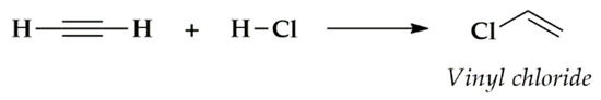 Searching for a replacement of the Hg-based catalyst normally used in the acetylene hydrochlorination reaction (Scheme 8), of vital importance for the production of PVC, Dai et al. (2015) studied the application of mesoporous carbon nitride as a support for an Au catalyst. The work concluded the effectiveness of the catalysts and the ability of the support to control the metal surface distribution [93].