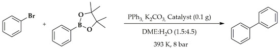 A palladium catalyst was prepared by microwave-irradiation-assisted deposition on exfoliated graphitic carbon nitride and applied in Suzuki coupling reactions [100]. The catalytic performance of the obtained catalyst was evaluated in the reaction of bromobenzene with phenylboronic acid pinacol ester under optimized conditions (Scheme 9). The catalyst revealed very good catalytic behavior and outperformed other homogeneous catalysts tested as well as more conventional heterogeneous catalyst. Additionally, the catalyst proved to be stable and no leaching was observed. The authors concluded that the carbon nitride support plays a central role in the catalyst properties.