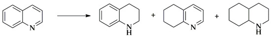 Wang et al. (2017) developed a new synthetic method to obtain a single ruthenium site supported on nitrogen-doped porous carbon (Ru SAs/N−C) using MOF UiO-66 as precursor [104]. Ensuring that the Ru single atoms were stabilized in the interior of pores, the aggregation of the metal particles during pyrolysis was avoided. The obtained catalyst was applied in quinoline hydrogenation reaction (Scheme 10) and revealed improved selectivity compared to a similar material where the metal particles are clusters. Additionally, the authors were able to demonstrate the stability of the Ru SAs/N−C, since TEM images after 5 reaction runs revealed that the atomic dispersion of Ru atoms remained unchanged.
