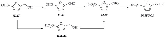 Reaction pathway for the oxidation esterification of 5-hydroxymethylfurfural (HMF) to dimethyl furan dicarboxylate (DMFDCA) [107].