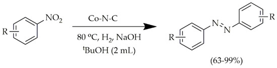 In continuation within the scope of hydrogenation reactions, Liu et al. (2018) reported an ultradurable and reusable Ni SAC with high hydrothermal stability useful in hydrogenation of biomass-bearing unsaturated groups, under mild reaction conditions, showing an excellent catalytic activity for the hydrogenation of nitroarenes and unsaturated compounds such as styrene, phenylacetylene, among others [115]. The catalyst was prepared from Ni(phen)3 dispersed on MgO and subsequently pyrolyzed at 600 °C in N2 atmosphere, the initial MgO support being removed by acid etching. This Ni SAC presented high Ni loading (7.5 wt.%) in which Ni is covalently bound to N atoms, the catalytic active sites comprising (Ni-N4)-N. The authors experimentally confirmed the involvement of Lewis basic sites in the nitroarenes hydrogenation. In the same context, some of these authors used a similar synthetic strategy to prepare a Co SAC exhibiting an excellent catalytic performance in the hydrogenative coupling of nitroarenes chemioselectively yielding the corresponding azo compounds [116] (Scheme 12).
