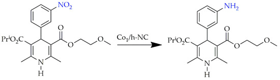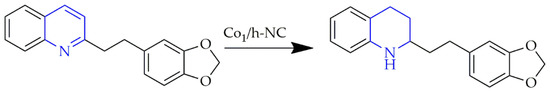 Much more recently, Long et al. (2020) developed an atomically Fe dispersed on phosphorus doped porous carbon active in hydrogenation of nitroarenes, N-heterocycles such as quinolines, and reductive amination reactions [117]. The synthetic strategy consisted of using Fe impregnated SiO2 nanoparticles, SiO2 as sacrificial hard template and sucrose and phytic acid as carbon and phosphorous precursors, and pyrolyzed at different temperatures from 700 to 1100 °C. The authors attributed the excellent catalytic activity and selectivity to the presence of Fe-P4 sites, in situ generated by reduction of initial O2-Fe-P4 species, demonstrating that Pgrap is key in the hydrogenation reaction. In the same context, metal (Co, Fe, Ni, Mn, Cu) single atoms tethered on a hierarchical mesoporous N-doped carbon prepared by molten salt assisted method, in the presence of chitosan and melamine as carbon and nitrogen precursors, involved in the selective hydrogenation of bioactive pharmaceuticals such as nimodipine (Scheme 13) or large sized quinolines, 2-(3′,4′-methylenedioxyphenylethyl)quinoline (Scheme 14) for instance, have been recently reported [118]. The authors attributed the notably superior catalytic activity mainly to the accessibility of metal sites and to the hierarchical porous structure.