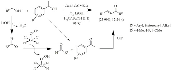 SACs comprising highly dispersed Co atoms onto N-modified graphene were also reported for the selective aerobic oxidation of benzylic alcohols to benzaldehydes exhibiting high conversions and selectivities (94.8% of conversion with 97.5% of selectivity to benzaldehyde) [78]. In this case, the catalysts were prepared from graphene oxide (GO) and Co(NO3)2 aqueous solution and subsequent thermal treatment at different temperatures under NH3 ambient. While the oxygen content of the samples diminished when increasing the pyrolysis temperature, the nitrogen loading was increased, favoring thus the coordination with Co and enhancing the catalytic performance.